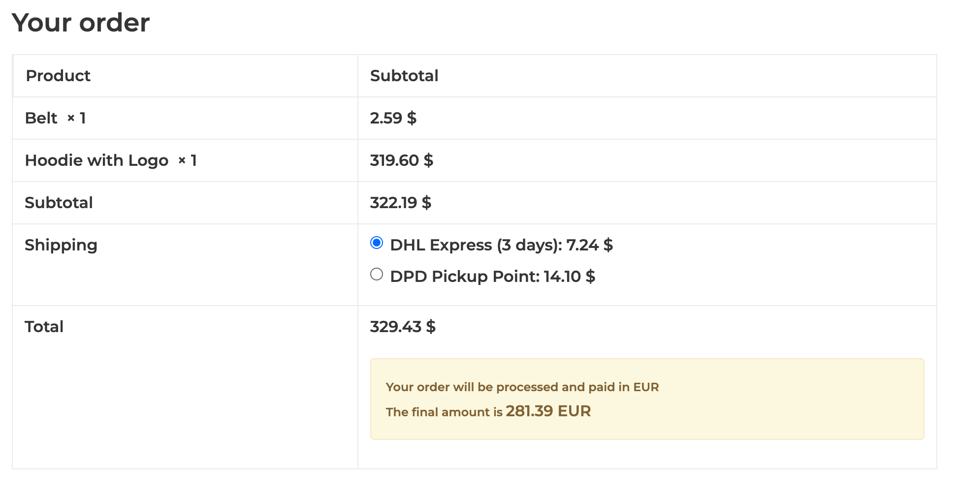 WooCommerce plugin pro přepočet objednávky do cílové měny a přesměrování na platební bránu s upozorněním zákazníka při checkoutu.